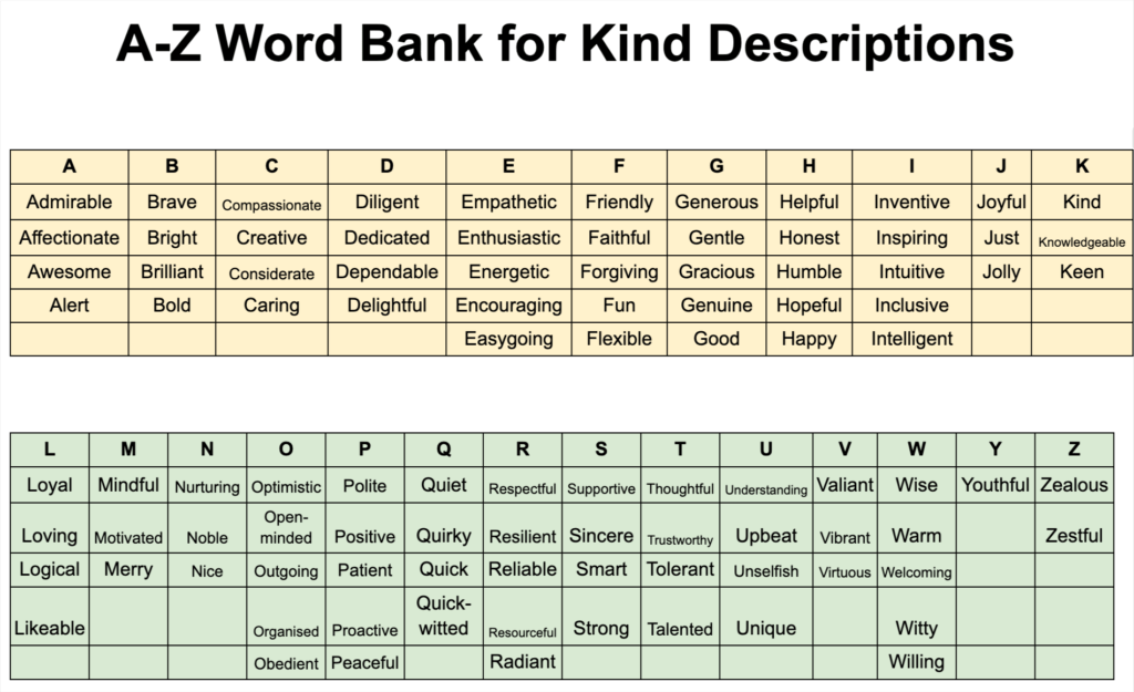 I put together this Kindness Word Bank to help children come up with suitable words for their classmates: